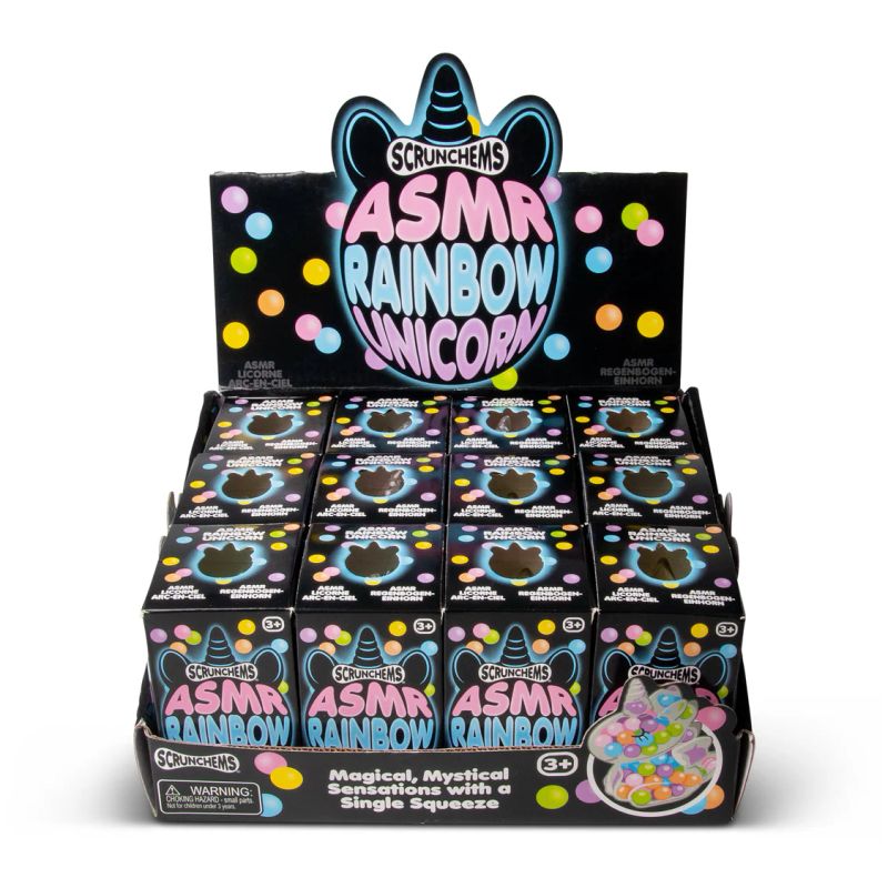 Opplev en helt unik sanseleke med Scrunchems ASMR Rainbow Unicorn. Denne magiske enhjørningen er fylt med fargerike regnbueperler som gir en fascinerende tekstur og et behagelig squish når du klemmer på den. I tillegg lager den små, beroligende lyder som gir en ekte ASMR-effekt – perfekt for både stresslindring og lek.