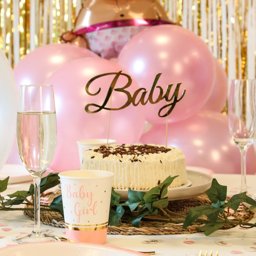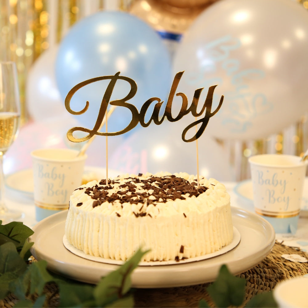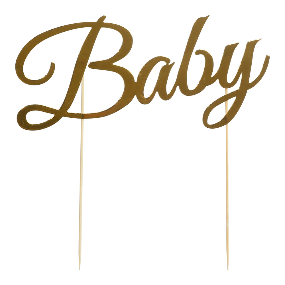 Denne gullfargede kakedekorasjonen med teksten Baby er en enkel og elegant måte å pynte kaken på til babyshower, dåp eller navnefest. Dekoren er laget av FSC‑sertifisert papir og kommer med en trepinne som gjør den enkel å plassere i kaken.