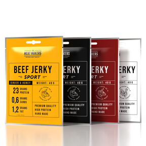 Nøkkelord: sports jerky mix, protein jerky, meat makers sport, beef jerky mix, turkey jerky mix, peppered jerky, ginger honey jerky, treningssnack, høyprotein snack, turmat kjøtt, energirik jerky, premium kjøttsnack, sportsnæring jerky, variert jerky pakke, kvalitetskjøtt snack