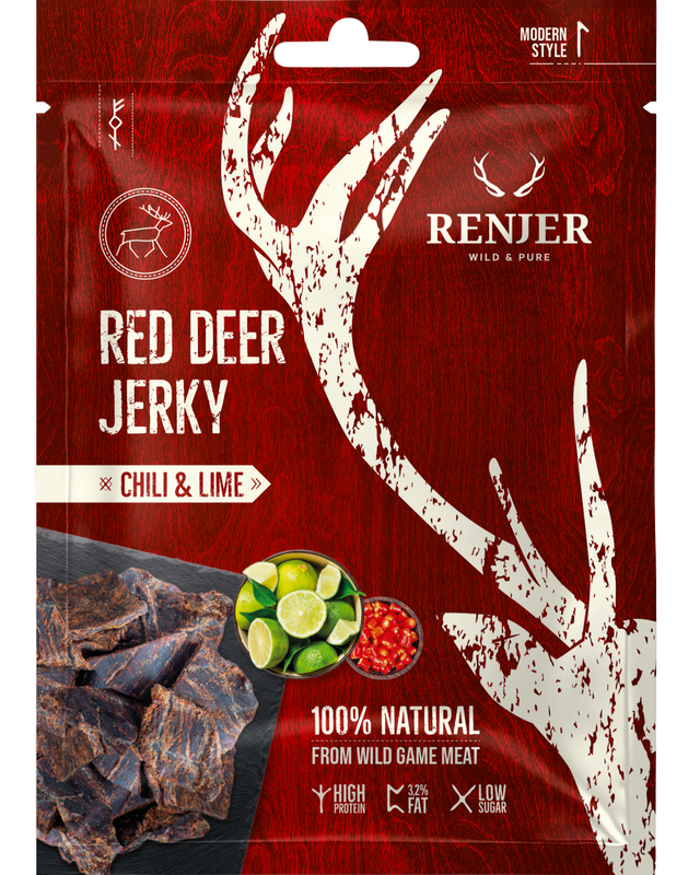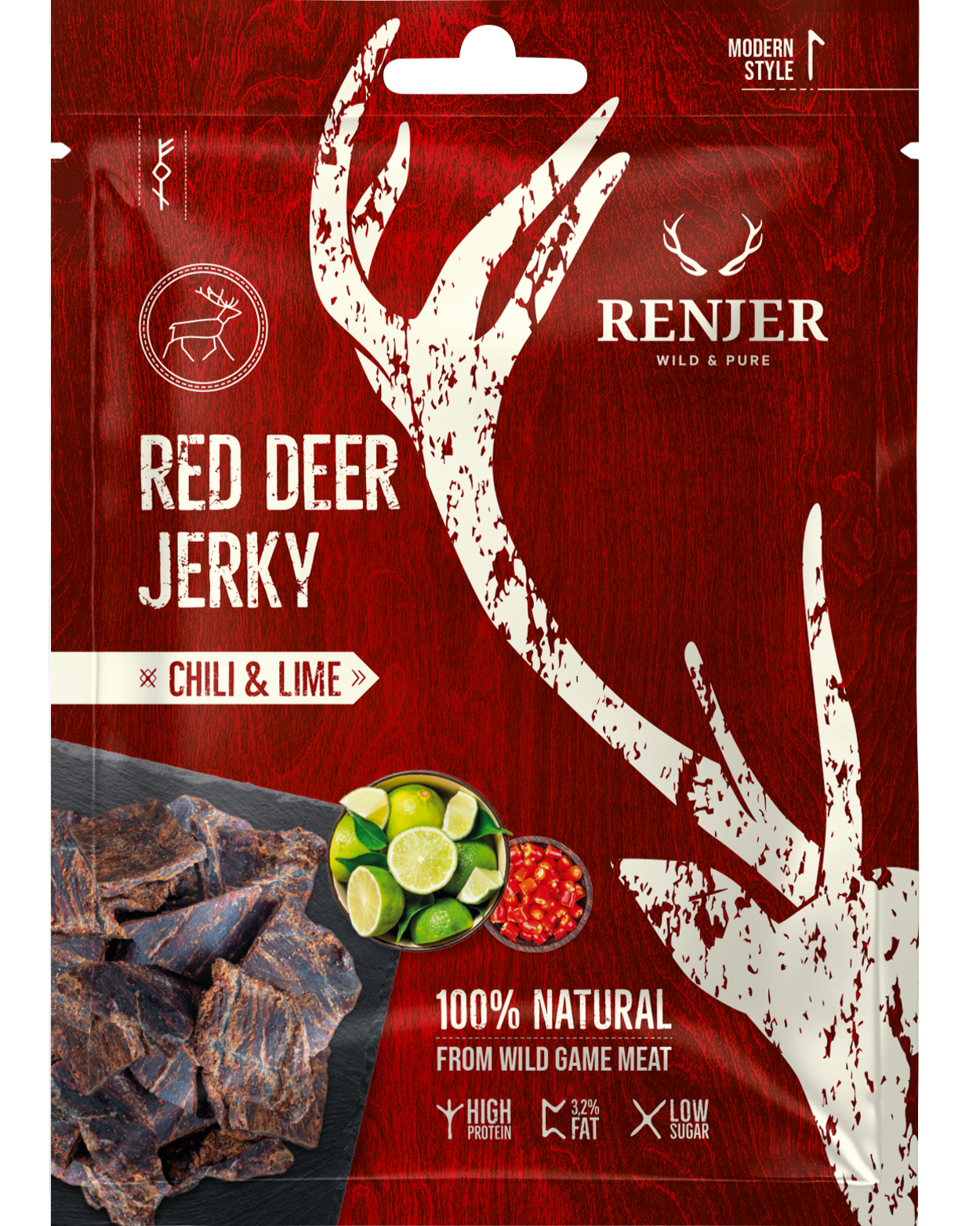 Renjer Hjort Jerky med Chili & Lime gir deg en dristig og moderne vri på klassisk viltjerky. Laget av 100 % vilt hjortekjøtt fra jakt i skogene i Skandinavia og Baltikum, får du en autentisk og naturlig smak av europeisk vilt – løftet av en kraftig og frisk krydderprofil.