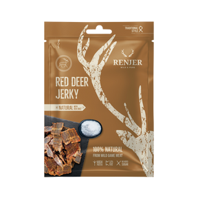 Renjer Hjort Jerky med Sjøsalt er en premium jerky laget av europeisk viltkjøtt av hjort. Med en minimalistisk oppskrift der kjøttet står i sentrum, får du en ren og autentisk smaksopplevelse. Et lett dryss havsalt fremhever den karakteristiske smaken av hjort, mens en forsiktig røykeprosess gir et subtilt ekstra lag av aroma uten å overdøve kjøttets naturlige karakter.