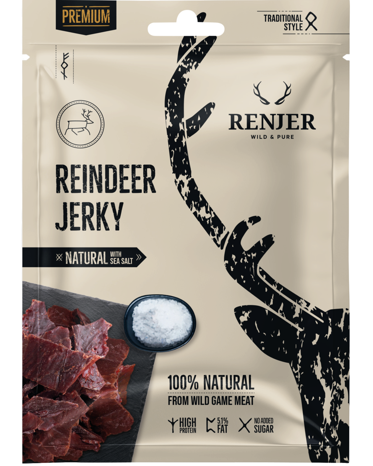 Renjer Reindeer Jerky med Sjøsalt er en eksklusiv og minimalistisk jerky laget av reinsdyrkjøtt fra det urørte Lappland. Med kun to ingredienser – kjøtt og havsalt – får du en helt ren og naturlig smak der kvaliteten på råvaren står i sentrum. Den milde røkte karakteren fremhever reinsdyrkjøttets unike smak uten å overdøve den.
