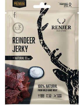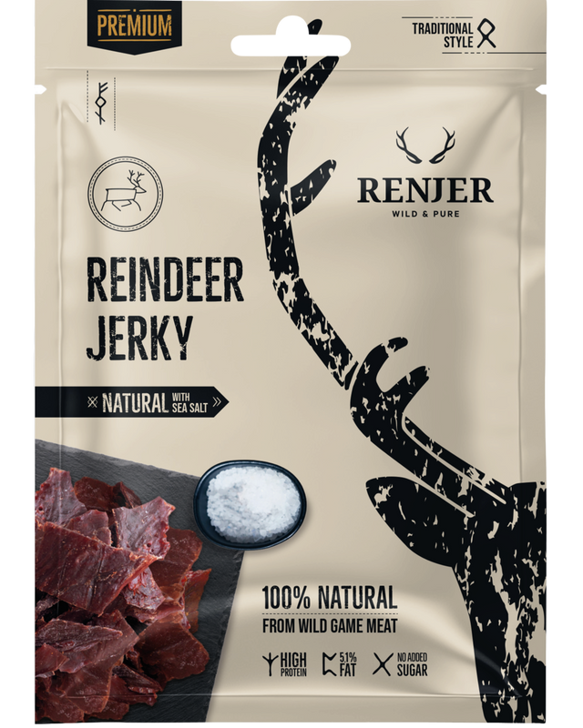 Nøkkelord: renjer reinsdyr jerky, reinsdyr snacks, nordisk jerky, reinsdyrkjøtt tørket, premium reinsdyr, naturlig jerky, proteinrik reinsdyrsnack, turmat reinsdyr, havsalt jerky, ren jerky uten tilsetninger