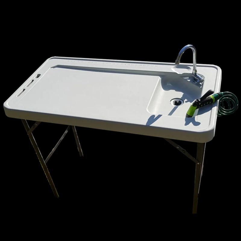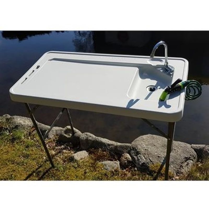 Oppgradert modell med nedfellbar kran og slange med spylemunnstykke for enkel rengjøring av bordet og skylling av fangst. Meget velegnet for bruk til sløying av fisk, eller utekjøkkenet.