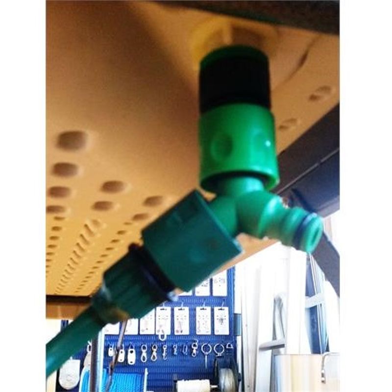 Leveres komplett med armatur, avløpsslange, spyleslange med spylepistol og hurtigkobling for hageslange.