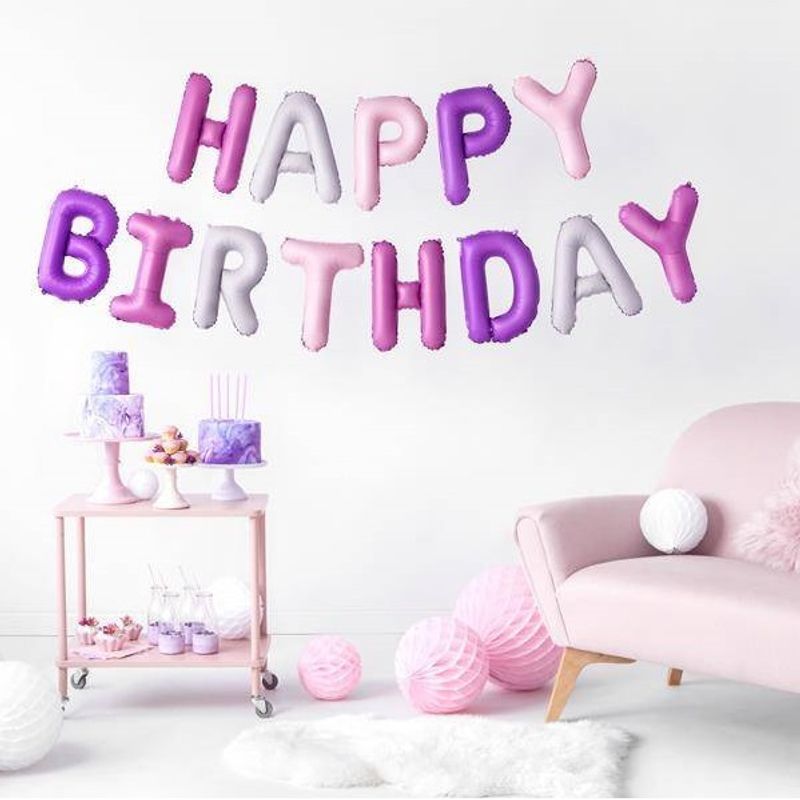 Sett med bokstavballonger som danner ordet happy birthday. Fargekombinasjon av rosa,lilla og hvit som passer ypperlig til bursdagsfest med prinsesse eller enhjørning / unicorn tema.