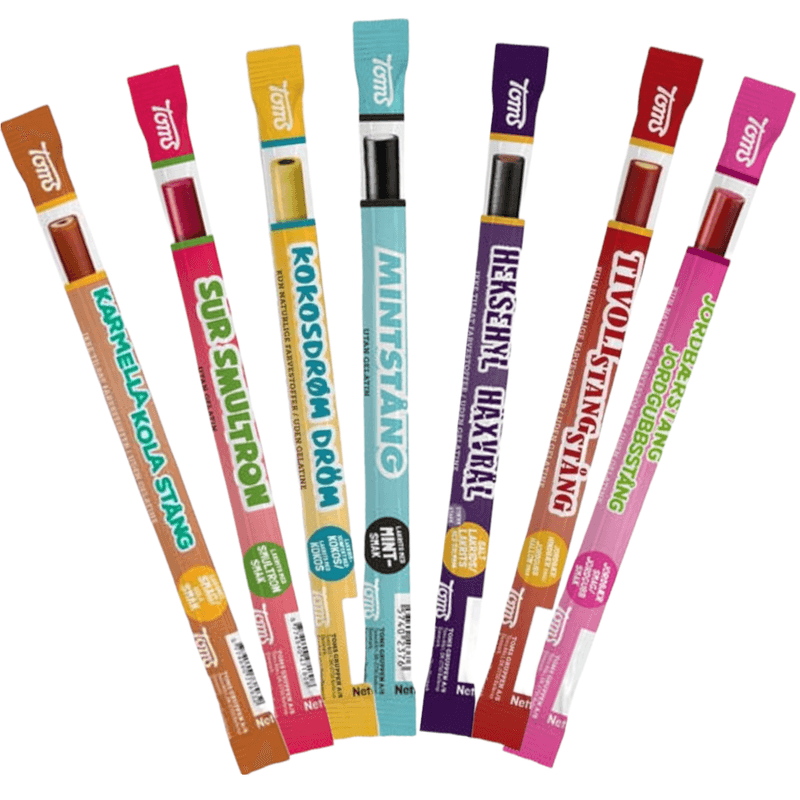 Tivolistang Ingredienser: Sukker/socker, glukose-fruktosesirup/-sirap, hvedemel/hvetemel/vetemjöl, modificeret majs- og kartoffel-/potetstivelse/modifierad majs- och potatisstärkelse, helt hærdet/herdnet/härdat vegetabilsk fedt/fett (palmekerne/-kjerne/palmkärna, kokos), fugtighedsbevarende middel/medel (glycerol/glyserol), emulgator/emulgeringsmedel (mono- og diglycerider af fedtsyrer), fortykningsmiddel/förtjockningmedel (arabisk gummi), syre/surhetsreglerande medel (æble-/eplesyre/äppelsyra), salt, farvestoffer/fargestoffer/färgämnen (carmin/karmin, curcumin/kurkumin), aromaer/aromämnen, antioxydant (ascorbinsyre/-syra). Fyld/fyllning 60%.
