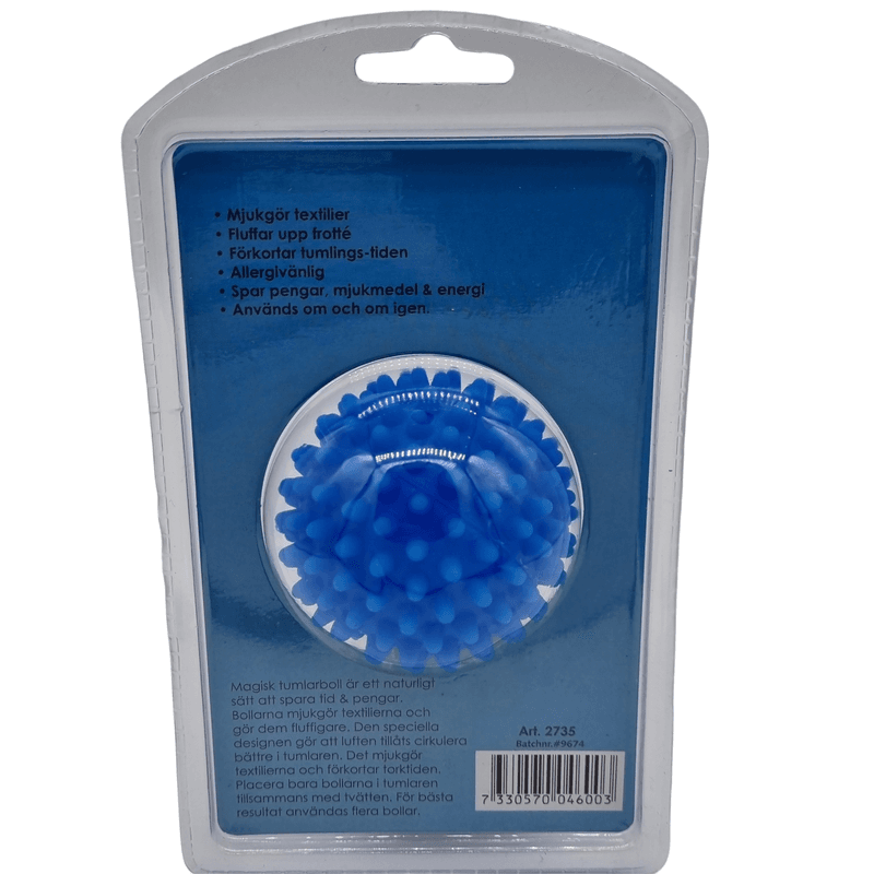 Tørkeball for tørketrommel. Legg sammen med klær, håndklær, jakker og lignende når du tørker. Ballene er med på å skape mer luft mellom plaggene slik at de skal bli enda mer myke og luftige. Ballene kan hjelpe til så tørketiden blir kortere. Mange slike baller er veldig harde som bråker veldig i tørketrommelen og kan skade tøyet. Denne er litt mykere og mer skånsom, men gjør samme nytten.