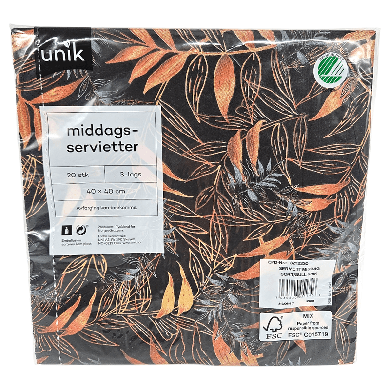 These are extra large dinner napkins in 3-ply quality, made in Germany from FSC mixed paper and the Nordic Swan Ecolabel. The Unik logo is only printed on the plastic packaging and not on the napkins themselves, making them ideal for more formal occasions.