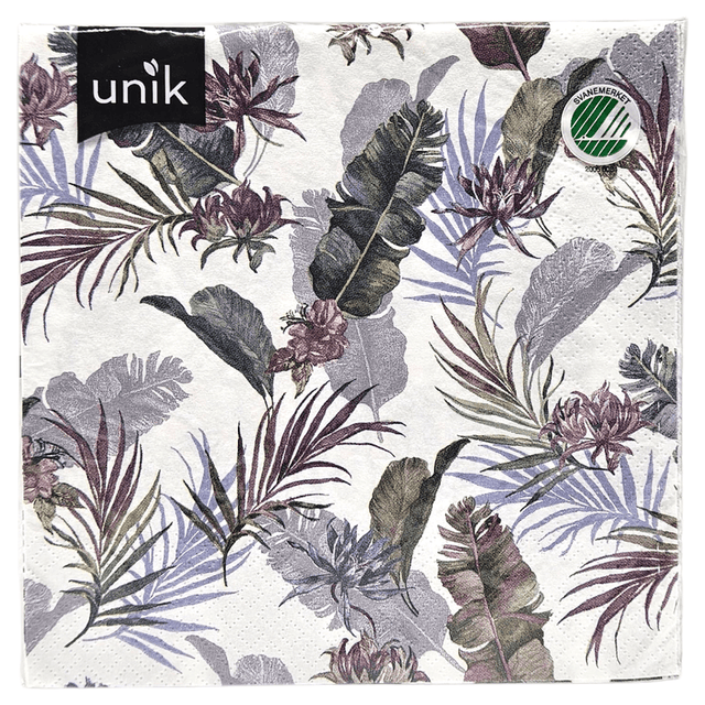 Napkins Tropical Dream 20pk 3-ply are a fresh addition to the summer table setting. With a white background and soft, diffuse colors of tropical leaves and flowers, these napkins create a calm and elegant atmosphere. They are perfect for everything from barbecues to tropical theme parties. Produced in Germany from FSC-mix paper and the Nordic Swan Ecolabel. The Unik logo only appears on the plastic packaging and not on the napkins themselves.