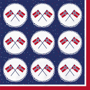 Skap den rette stemningen til nasjonaldagen med dekorative servietter i rødt, hvitt og blått. De er pyntet med mange små norske flagg og passer perfekt til borddekking på 17. mai eller andre anledninger hvor Norge feires.
