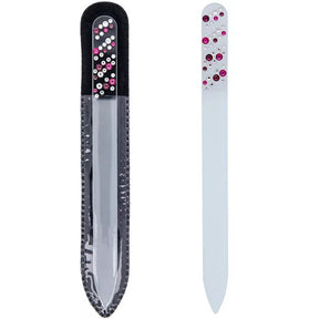 Dekorativ glassfil med myk, ekstra fin slipeflate for naturlige negler. En glassfil er ekstra skånsom mot neglen og forhindrer at neglen fliser seg. Filen har lang holdbarhet og er mer hygienisk enn en vanlig fil, da den er enkel å vaske og holde ren. Etuiet beskytter filen mot kutt og riper. Filen er vakkert dekorert med strasstener.