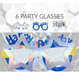 Pakken inneholder 6 briller fordelt på 3 ulike design med 2 av hver. Motivene inkluderer glinsende stjerner, blå briller med "Happy Birthday" tekst og fargerike briller med dekorative kakelys på toppen. Perfekt til både barnebursdag og voksenfeiring.