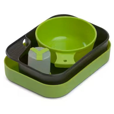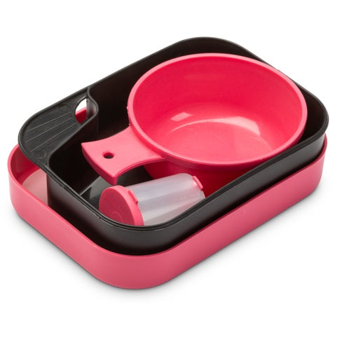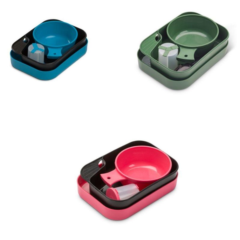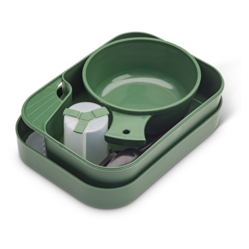 Tallerkenboks med tallerkener, bestikk, krydderbeholder og kopp. Perfekt for utflukter, camping, fjellturer og fotturer. Finnes i ulike fargekombinasjoner. Fri for BPA. Tallerkenboksen inneholder 2 dype tallerkener, mellomstor kopp, kombinasjonsbestikk, salt- og pepperstrøere.
